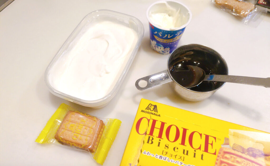 ヨーグルトにビスケットなどを刺して